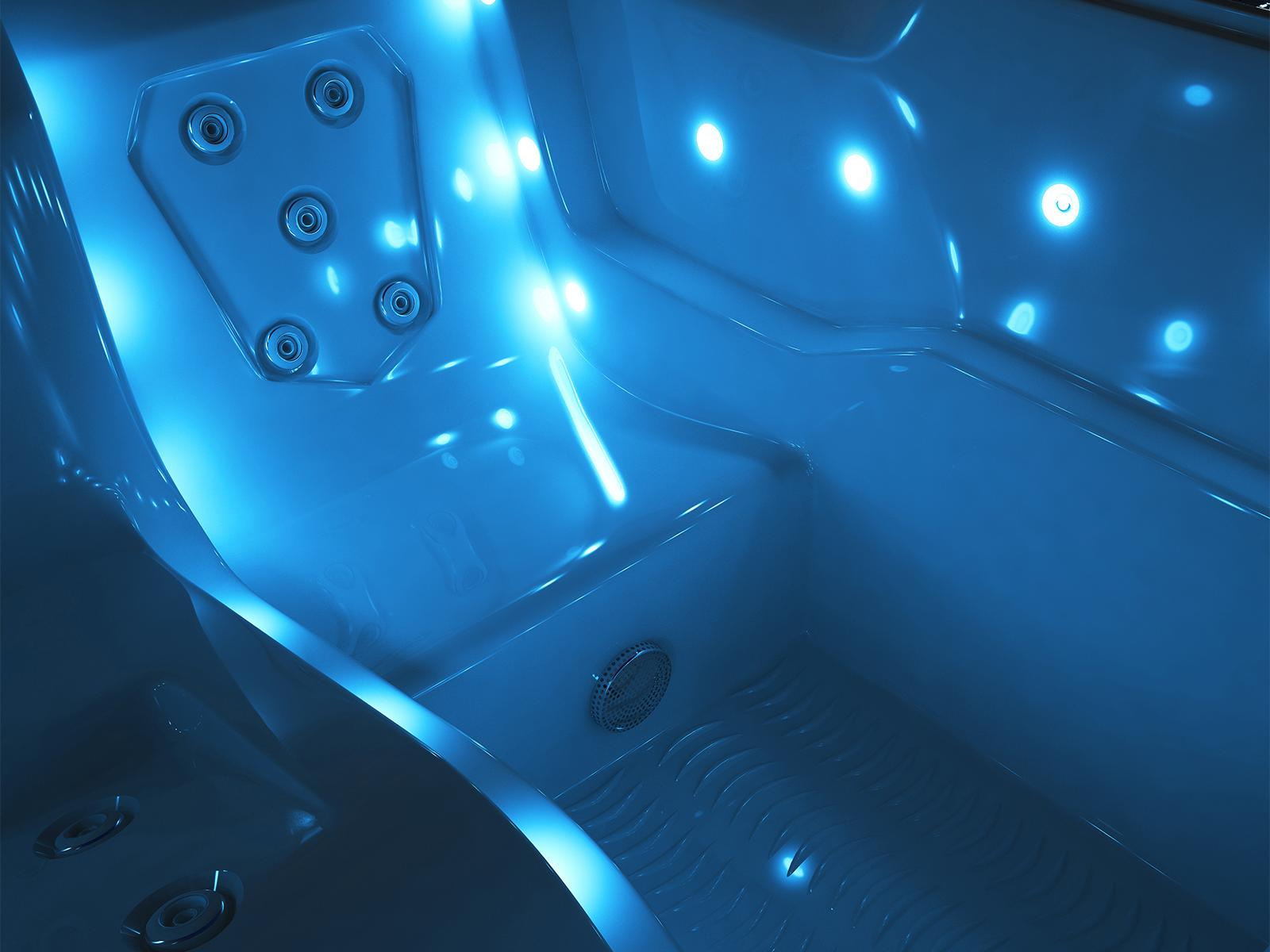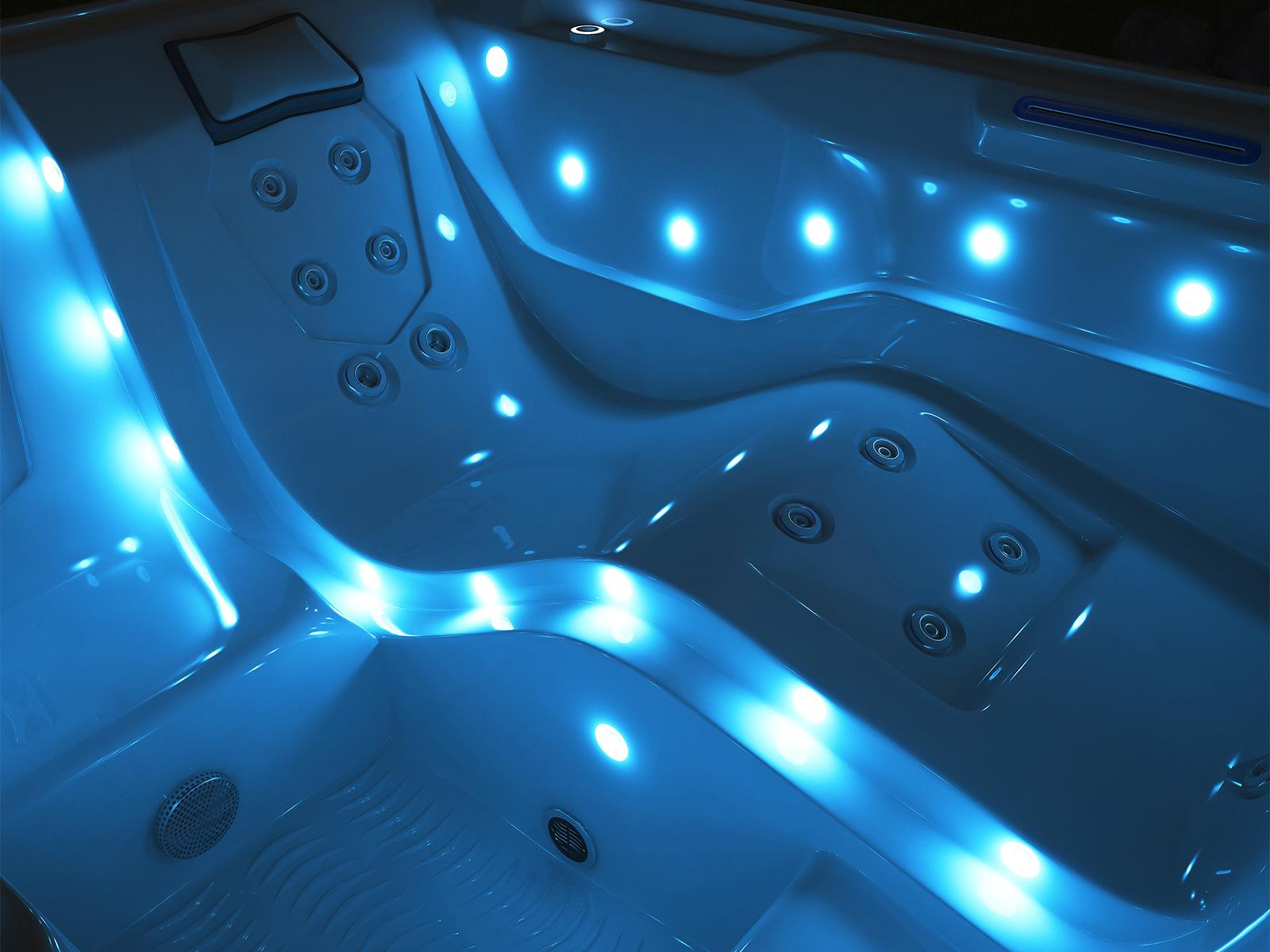 Modern Collection and Modern Collection spas feature our highest count of lights for a stylish soak. The interior lighting system features multiple points of light placed to accent the contours of the spa shell. Two exterior LED light bars integrate with the front corners of the spa, creating a uniquely elegant look that is unlike any other. Match the color to your mood by selecting the hue and brightness of your choice or cycle through all six vibrant choices.